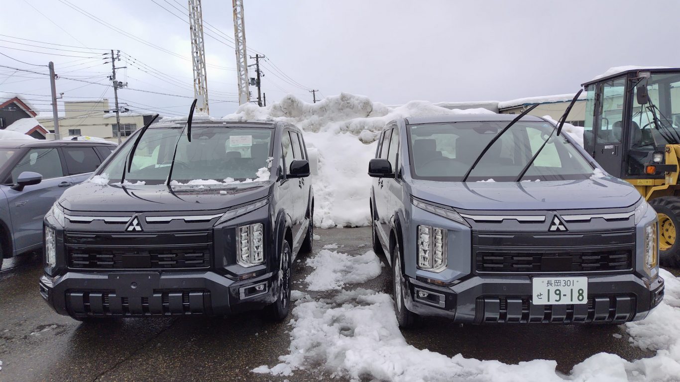 こちらが新型デリカD-5で左がグラファイトグレーとブラックマイカの2トーン 右が新色のムーンストーングレーとブラックマイカの2トーンになります。フロントグリルの違いがお分かりでしょうか?